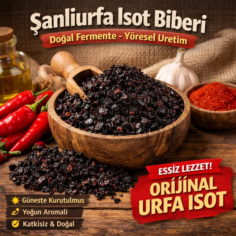 Şanlıurfa isot biberi, kendine has aroması, koyu rengi ve dengeli acılığıyla sofraların vazgeçilmez lezzetlerinden biridir. Geleneksel yöntemlerle güneşte kurutulup gece terletilerek fermente edilen isot, bu özel süreç sayesinde yoğun bir tat ve hafif isli bir aroma kazanır.